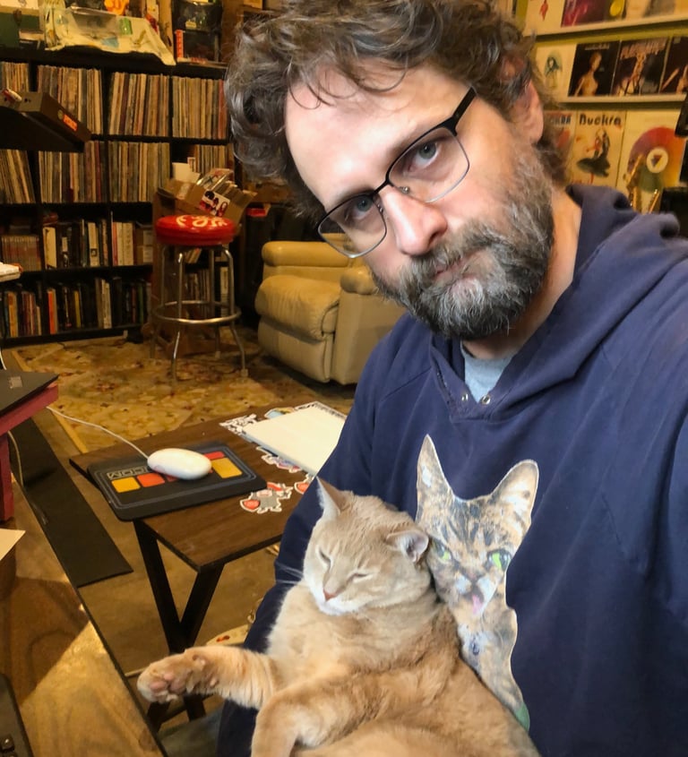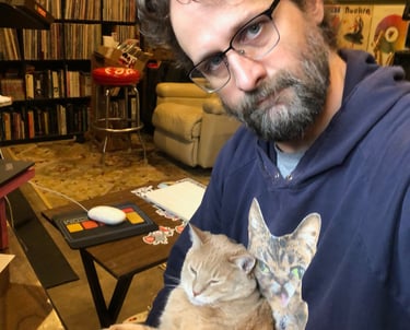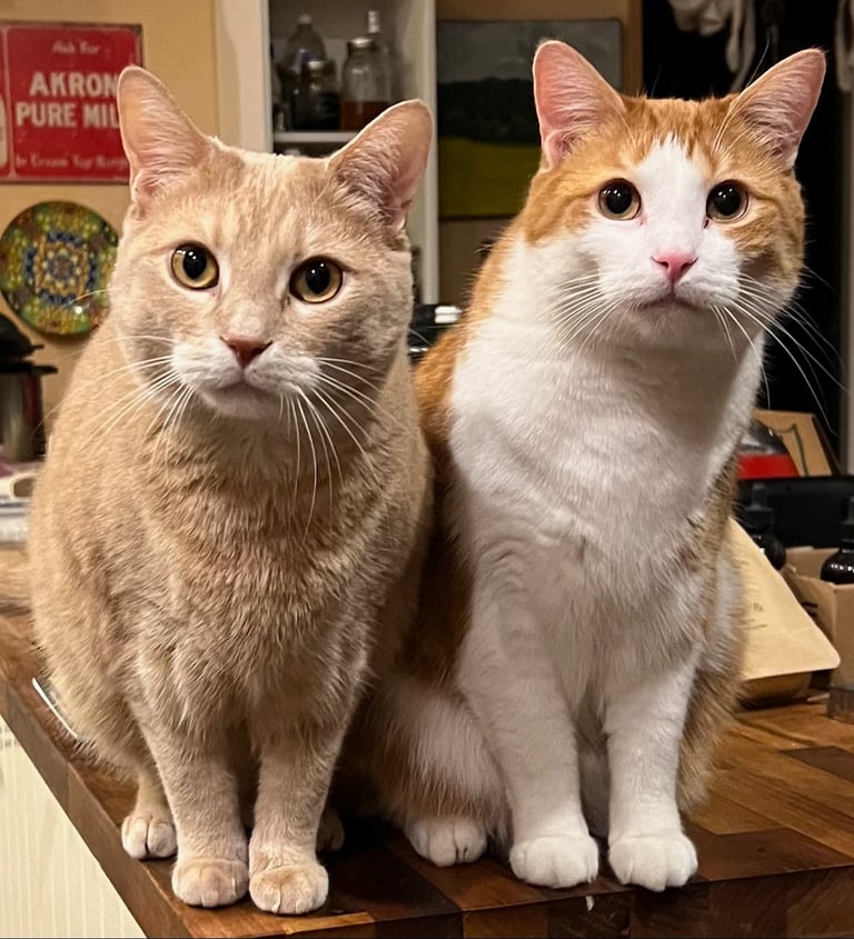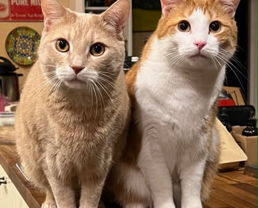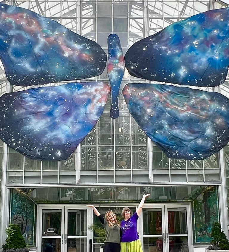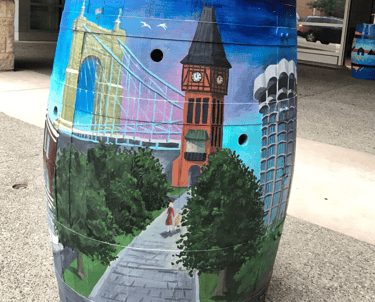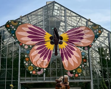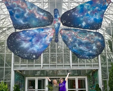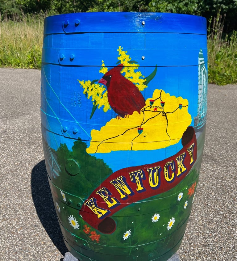 My husband Lee, my cats Graham and Chopper and some of the projects I'm most proud of: Painting the butterfly at Krohn Conservatory 3 times and 2 rounds of bourbon barrel paintings for Covington KY and Newport KY